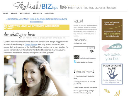 Two of my dear blog friends have exciting news this week: Jena of Modish just unveiled a new section to her already fabulous blog called Biztips — she’s been a huge help to the community, and writes one of the best business tips on running your indie business — whether you’re an artist, crafter or just someone who sells handmade items.