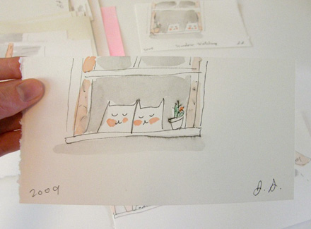 And she has a new series of very limited edition prints (10 per drawing) in her Etsy shop — a lovely collection called ‘Window Cats’ that’s done with ink, gouache and colored pencil on 100% cotton rag paper, signed and dated.