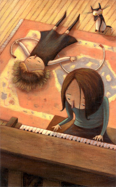 Since graduating art school three years ago, I’ve been following the artwork of children’s book illustrator Kelly Murphy. I really would like to illustrate children’s books but I have problems drawing people. Her work has taught me to let go of the confining concepts of how human anatomy “should” look. Murphy’s work has inspired me to let the natural way I create people and the emotion/mood involved come through my artwork.