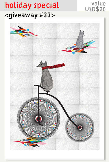 The fourth giveaway of the holiday special comes from Thereza Rowe, a London-based illustrator and graphic designer who is offering ONE Pikaland reader a Fox Ride print from her shop. (You’ve gotta love foxes with rides of their own!)