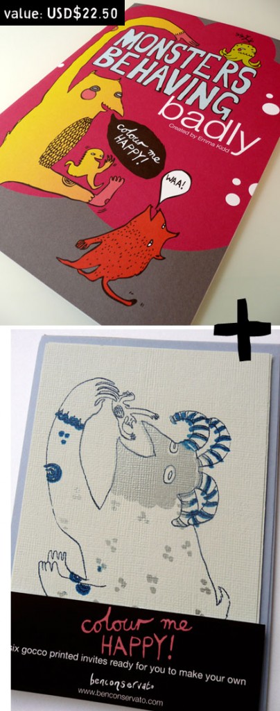 She’s giving away a set of Monsters Behaving Badly Colouring Book and a 6-pack of Colour Me Happy Gocco Party Invites to ONE lucky reader if you’ll share with us your favorite monsters (real or imaginary!)