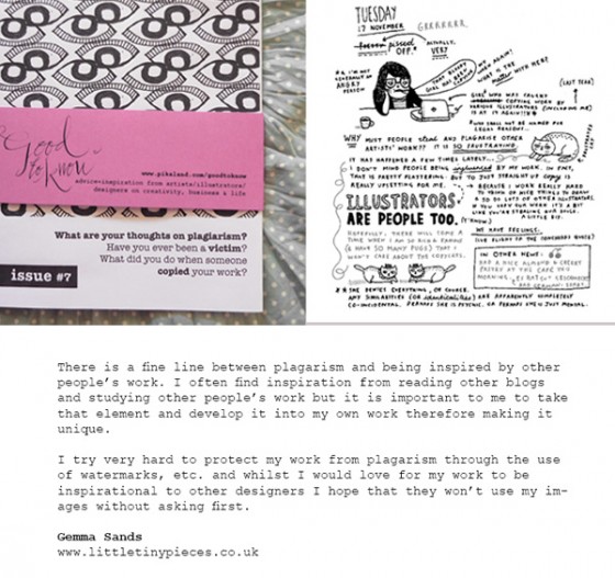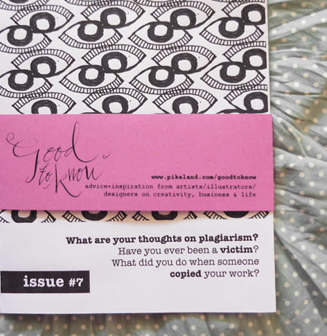 As plagiarism is the topic for the latest Good to Know zine, we hear from other participants on what happened to them, and what steps they took to handle the matter. Some shared with us their difficult stories, and others had uplifting words of advice, but we were very touched by those who responded and shared generously. In that same spirit of generosity, the entire copy of the Good to Know issue #7 is available to read online over on ISSUU. (For those who still love a physical copy/ or prefer to read a downloaded copy, you can get their fix right here. )