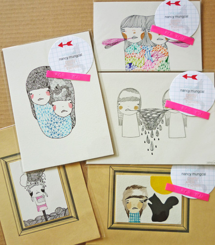 I have a background in fine arts and a day job in graphic design, and my work has developed into a product of the two disciplines. I doodle, cut paper, and paint in my tiny studio in the tiny apartment I share with my boyfriend and two cats. I like portraits, small sizes, and primary colors.