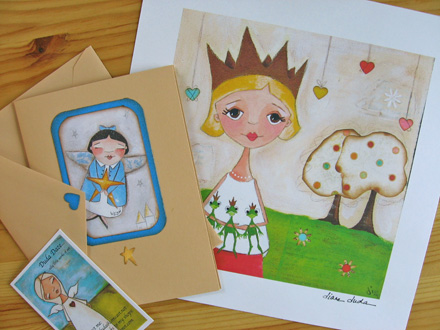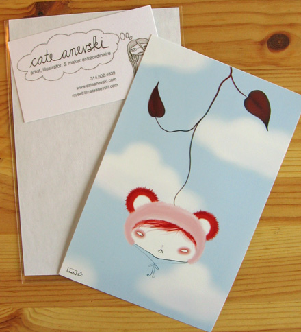 I love that the business cards of Cate Anevski states that she is an artist, Illustrator, and maker extraordinaire! A look through her work at her old shop called Bees Knees Industries (she recently moved shop and this one will be one for her more crafty endeavors) shows that she enjoys working in a variety of media, from watercolors to woodburning.
