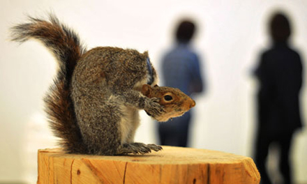 There was this part of the exhibition that you could see a lot of very small sculptures of these characters that he created and then, right before them you could read: “Do not trespass or alarm will be activated”. Of course, some of the visitors trespassed – and the alarm rang!