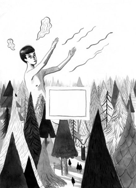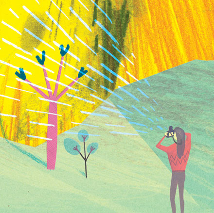 She can be found working with a mixture of charcoal, ink, pencil and paper cut outs, using the computer as a final editing tool. Vibrant colours reflect the playful side of her work which often celebrates the natural world, scientific exploration, botanical oddities and the mystery of the unknown.