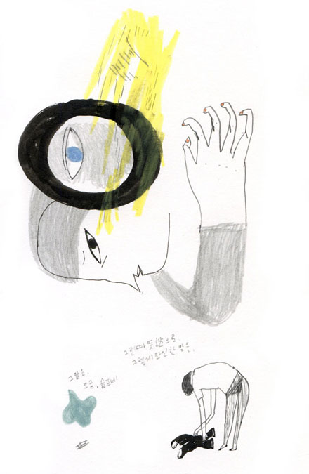 Seoul-born Yeji Yun’s work may look a little rough around the edges – but don’t let that fool you. While her sketchbook cum diary is filled with what may seem like rough pencil drawings, filled with Korean words (which I can’t decipher); I find them to be playful and emotional – a little more so than her commercial works that can feel more polished and grown up (but still retaining that sense of delight that shines through in her sketches.)