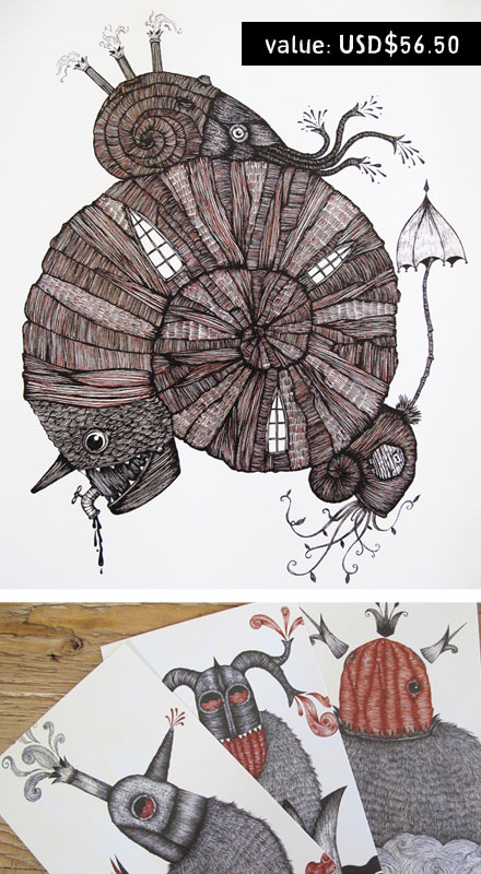 Today’s giveaway comes from Duane Hosein is an artist and illustrator based in New York, where he spent his childhood immersed in a world of his own – mostly behind a book or drawing at the dining table. As a result, his artworks primarily reflect on nature but with an added twist; with minute and detailed line work that seems to border on the obsessive.