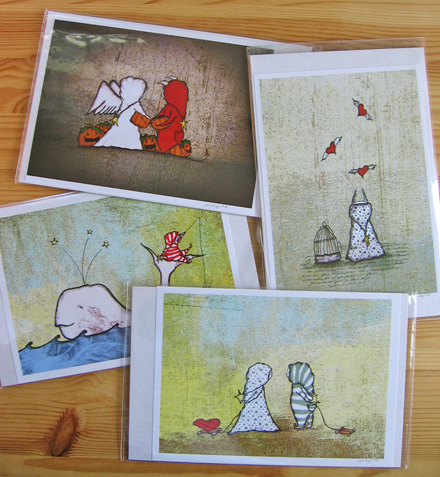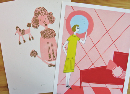 If you ever came across a Gocco print of a pink poodle, then you’ve stumbled onto Vivienne’s delightful work (this may probably be inspired by her ceramic poodle collection). Her gouache paintings of ladies in glorious patterned settings have a whimsical quality indeed; and she also has another Etsy shop where she has collage works up for sale. She’s also well-known as a constant inspiration to Matte Stephen, and together they live in Portland, Oregon!