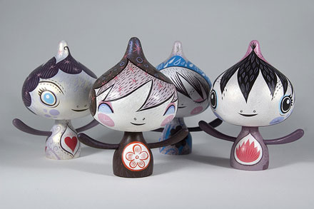 The Chicago-based visual artist draws inspiration from Japanese aesthetics, packaging design, magazine ads and urban graffiti and recently put up a few special edition wooden toys painted with acrylic up for sale — you can view the whole collection here.