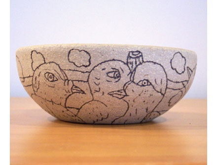 Aron Lowe’s shop has some quirky stuff, but this bowl with an incised and stained drawing on earthenware caught my eye — if you can’t make it out at first glance, it’s a bunch of pigeons resting on some telephone wires.