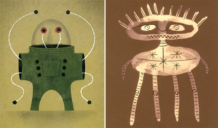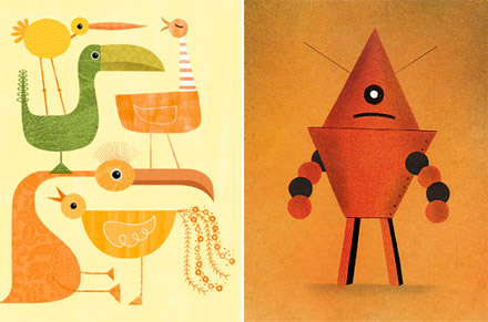 They recently took some time to work on a more personal project — a line of fine art prints for kids’ rooms that features colorful animals, robots and aliens in print at their Presto Bingo shop, that I think would liven up a child’s room brilliantly.