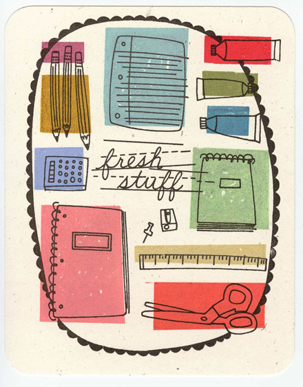 It’s a fact that I love cheery images and colors, so this Gocco print by Susan Estelle Kwas is right up my alley (and for a set of three at USD10, they are so very hard to resist!).