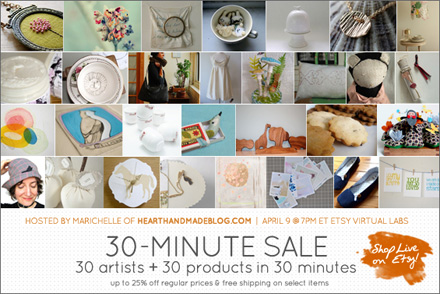 This is very short notice, but Marichelle of Heart Handmade is going to host the next Etsy Shop Live in a few hours (Thursday 7pm EST)!