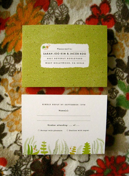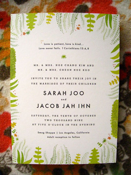 When I saw Erin Jang’s wedding invites made for Joo and Jacob I couldn’t help but smile. I loved everything: the colour scheme, the quirky handwritten type and how refreshingly simple yet attractive it was.
