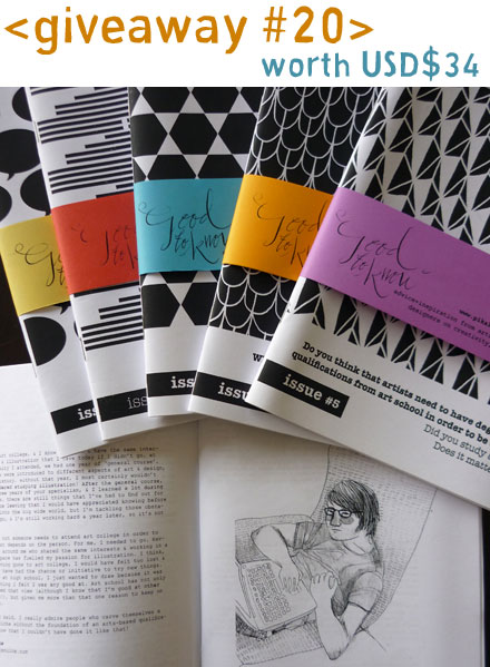 But then again I thought I shouldn’t let you all go off without at least a prospect of owning something lovely, so I’m putting up a giveaway for a complete set of Good to Know zines (yes, issues #1 through to #5!) to ONE lucky commenter.