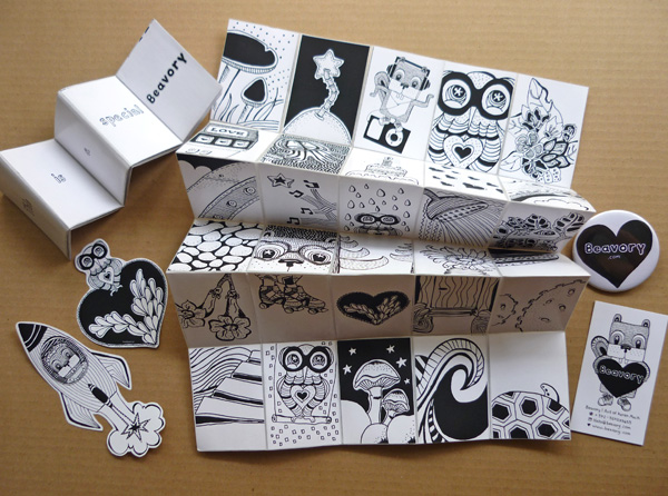 First off, just start something! It’s scary at first, but you will learn a lot from your first zine. Content is important – what do you want to say and how will you say it? After the first zine, start to think about presentation – how to make your zine beautiful and unique in its own way. The art, writing, and book format should inform each other so that your book stands as a unified whole – something that represents you and what you want to communicate to the world. Good luck and have fun!