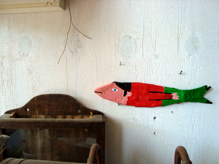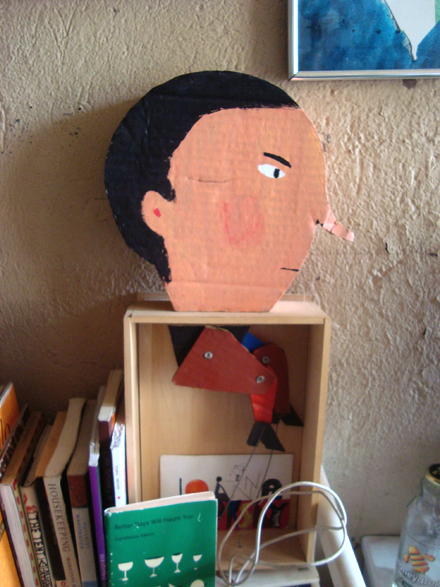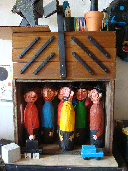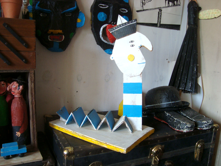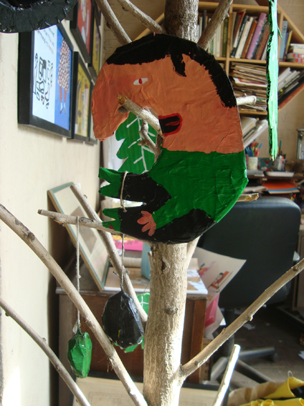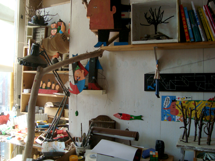 His studio is covered with his drawings and these characters that seem to be alive on the walls and hanging from the roof.